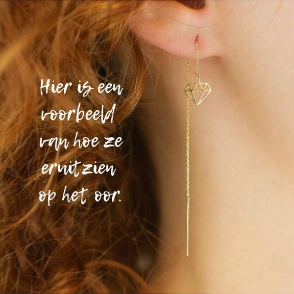 Het ontwerp van deze oorbellen bestaat uit dunne kettingen met aan het ene uiteinde een paal en aan het andere een lus. Deze eenvoudige maar elegante oorbellen zijn perfect voor dagelijks gebruik of formele evenementen. Ze vormen een geweldig alternatief voor traditionele oorbellen en zorgen ervoor dat jij zeker opvalt in de massa.