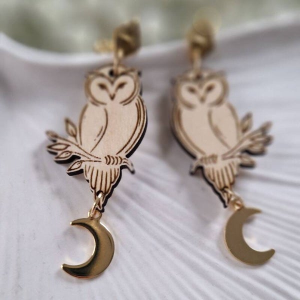 Ontdek onze prachtige houten oorbellen met lasergravure van de wijze uil en de betoverende maansikkel, gecombineerd met een stijlvolle roestvrijstalen hangertje. Deze unieke sieraden symboliseren wijsheid, intuïtie en nachtvriendelijkheid – perfect om je innerlijke kracht te accentueren.